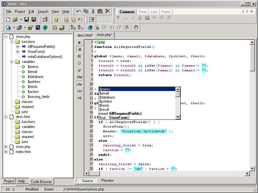 Hírek ehhez a verzióhoz: környezeti fordítás támogatása (juno_cz.lng, juno_en.lng fájlok), segítő az egyszerű űrlaphoz, sorvégződések beállítása (Win, UNIX, Mac), kódlap átalakítás mentéskor (így messze csak csehnek).